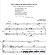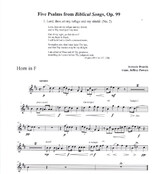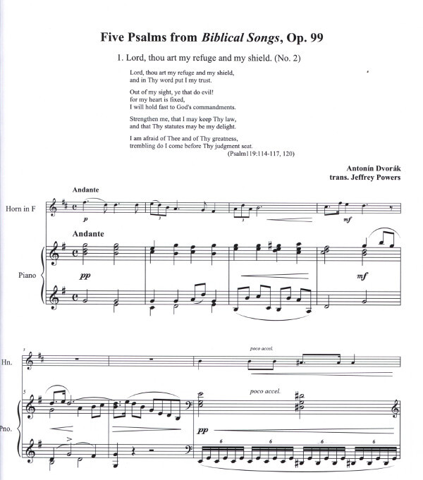 Mr. Powers selected five of the ten "Biblical Songs", Op.99 (1894) by Antonin Dvorak that he felt would be complemented through performance on the horn. He worked from the lower pitched settings of these songs for baritone voice retaining the original keys of that setting. Given that the music was conceived with the Czech translation of the Psalms in mind, Mr. Powers endeavored to retain the original rhythms of that setting wherever possible. The English translations of the texts from the Psalms are provided to help the performer better understand the meaning of the music and thereby be better equipped to portray its character. A broad, cantabile style of playing is recommended throughout.