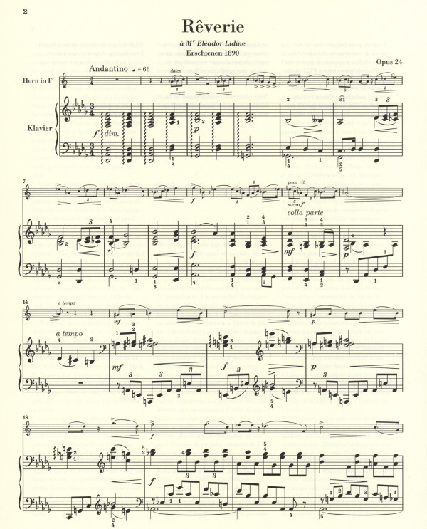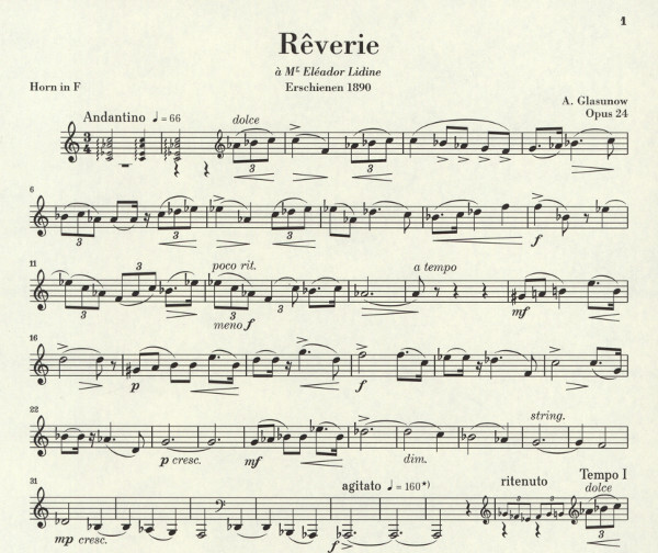 Alexander Glasunow war als Komponist in der spätromantischen Symphonik ebenso zuhause wie in der kammermusikalischen Form. Seine kürzeren Solostücke bestechen durch hinreißende Melodik und Liebe zum Detail so auch die Rêverie für Horn und Klavier. Glasunow selbst war ein guter Hornspieler und wirkte als junger Student in mehreren Orchestern mit. Aus jener Zeit stammt dieses hochromantische Werk, in dem Glasunow die sanglichen Vorzüge des Instruments bestens zur Geltung bringt. Ein wirkungsvolles Vortragsstück auch schon für fortgeschrittene Schüler, das wir hier erstmals im Urtext präsentieren; neben der Erstausgabe berücksichtigen wir auch erstmals Glasunows Autograph in der St. Petersburger Nationalbibliothek.