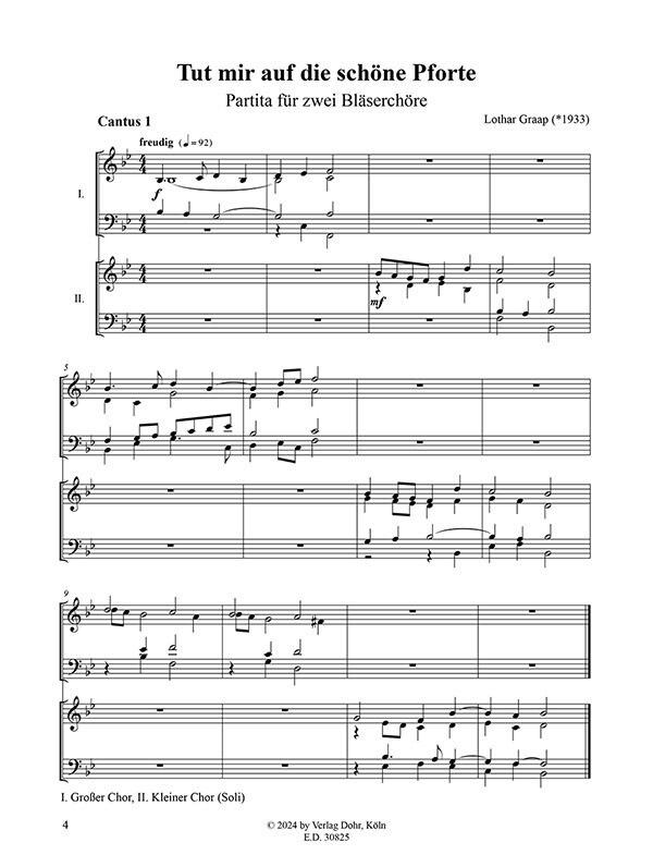 Die Partita ist für zwei gleich besetzte vierstimmige Bläserchöre (gleiche Stimmung für alle Stimmen; jeweils zwei Trompeten und zwei Posaunen) geschrieben: großer Chor und kleiner Chor (Soli), die in größeren Räumen vorzugsweise getrennt aufgestellt werden sollten.