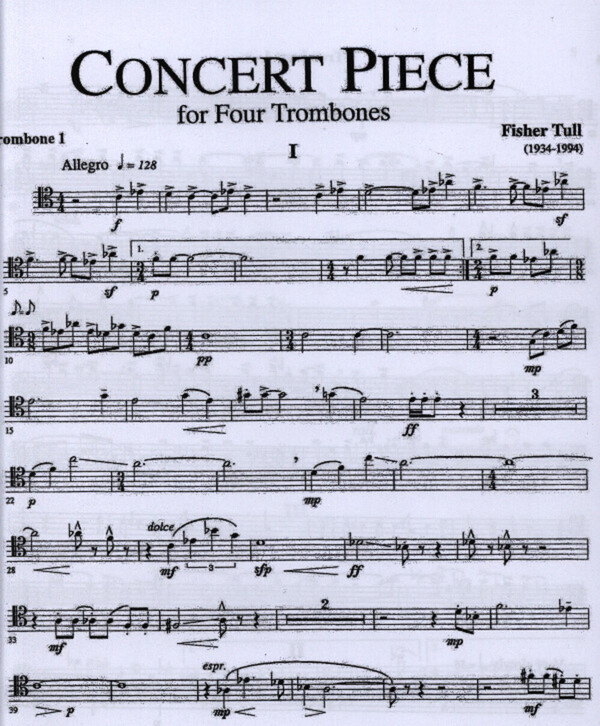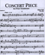 Concert piece for four trombones was composed in 1968. The three movements are set in the traditional fast-slow-fast. The highly energetic and rhytmically charged outer movements are contrasted by the lyrical melody and legato accompaniment in the middle movement.