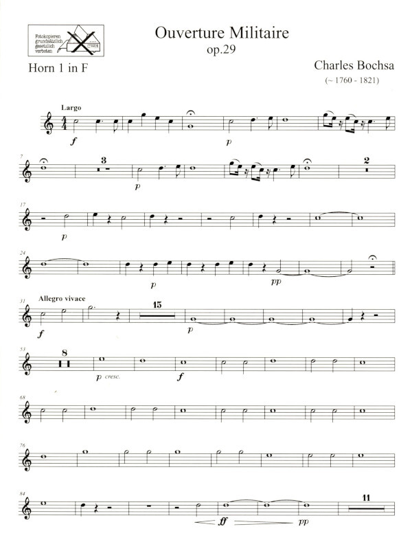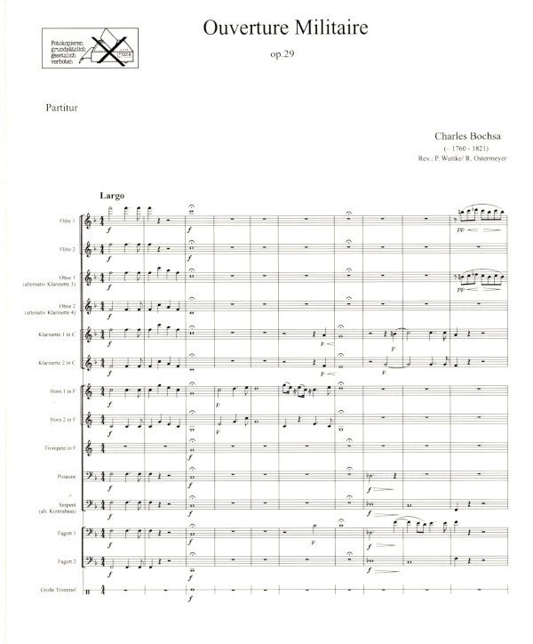 für 2 Flöten, 2 Oboen, 2 Klarinetten, 2 Fagotte, Serpent, 2 Hörner, Trompete, Posaune und große Trommel
