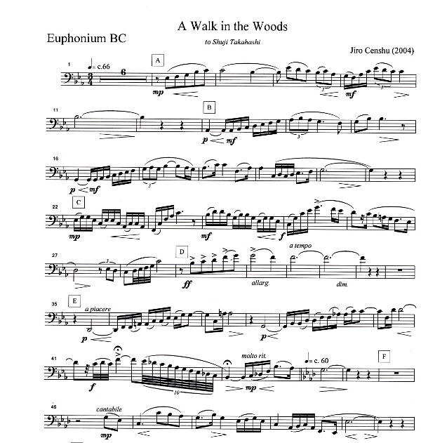 (für Shuji Takahashi geschrieben, 2004, Anmerkungen des Komponisten zu seinem Stück: "In unseren Gedanken hat jeder Mensch seinen eigenen friedlichen Wald, dort können wir einen Vogel singen hören, die Blätter rauschen hören oder das Wasser fließen. In dieser Oase regiert die Ruhe während sich unsere Gedanken mit den guten Dingen die vergangen sind beschäftigen." Dieses Stück ist eine liebevolle Pastorale in einer dreiteiligen Form mit weichen, melodischen Linien im Euphonium)