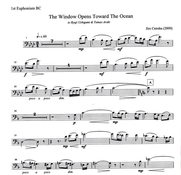 (2000 , dem Euphoniumspieler Ryuji Ushigami gewidmet, der Komponist schreibt zu se inem Stück: Ein großes Fenster vom vollen Sonnenlich geflutet. Endloser blauer Himmel und ein ruhiger friedlicher Ozean, durch diese zeitlose Szene kannst du das Lied des Ozean hören, diese Komposition ist ein kurzes Impromptu und zeigt die verschiedenen Farben des Wassers und basiert auf den Harmonien der Quarte)