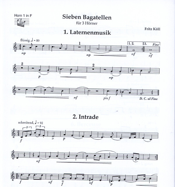 In the SIEBEN BAGATELLEN for three horns, Fritz Koells philosophy for composing is expressed especially clearly: to interpret the background with simple means. Without placing too many technical demands on the player, Köll knows exactly how to draw everything out of the middle range of the horn, thereby creating music that is sophisticated yet can be played by pupils and music lovers. The Laternenmusik at the beginning conveys a vivid image the night watchman calling on his horn. The Intrade announces the dignified arrival of esteemed guests with signals and bursts of fanfare. This, in turn, is followed by a Ballabile, which is suggestive of